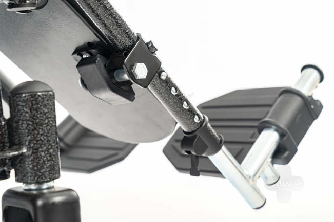 - Поворотные съёмные подножки с независимо позиционируемыми ортопедическими упорами для голени, поднимаются до горизонтального положения.
